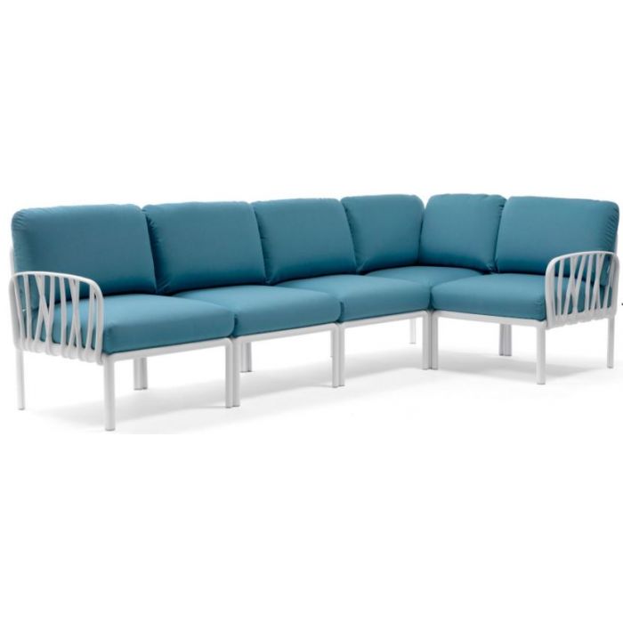 The Komodo 5 is the perfect sectional for your outdoor space. This outdoor furniture item features sturdy white frames and comfy cushions. Pair this new outdoor sectional with your coffee table.
